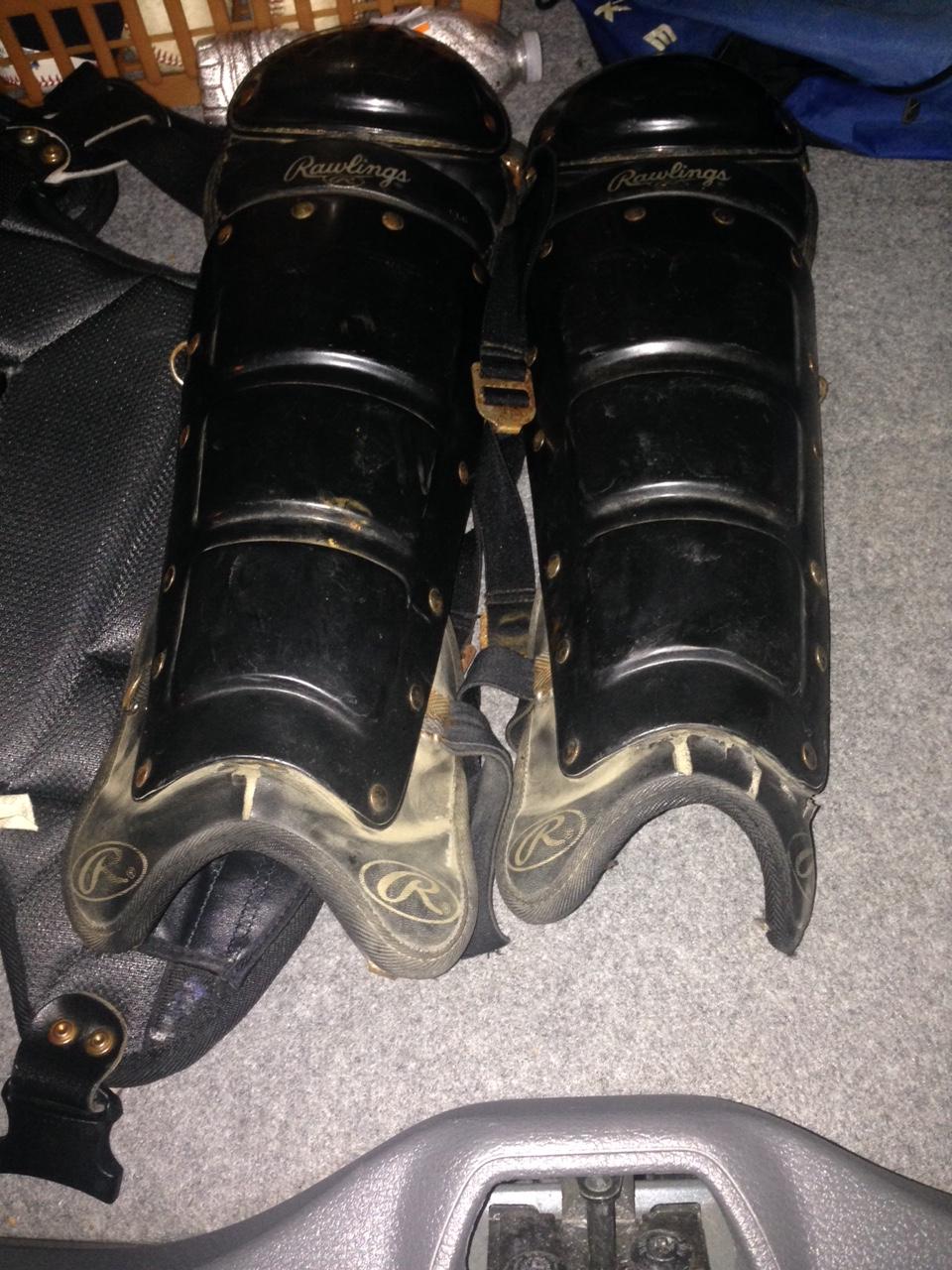 A relatively cheap pair of Rawlings guards. See photo attached. I don't even know the model -- I got a terrific deal on them and a couple other items nearly four years ago from a retiring umpire, but they're starting to outlive their usefulness. I'm just getting them through the fall season at this point.