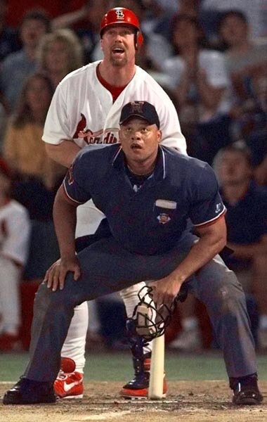 But one (pic) is of an MLB plate umpirein navy, mask in hand with letters MLB, not N or NL on his hat straddling the third base line lining up a Mark McGwire homerun line drive from his now infamous record breaking season. I don't know who the umpire is but his uniform fits him impeccably, his guns are HUGE and the look of intensity on his face and in his eyes in that photo made me want to look like that on any call I got to make. I still try to emulate that look on balls hit down the lines. Even though it was a now unliked navy shirt with red/white trim he still looked fantastic. And remember the navy was a step up in appearance for most umpires from the "mailman" Elbecos that some of us now covet. Crazy fashion.