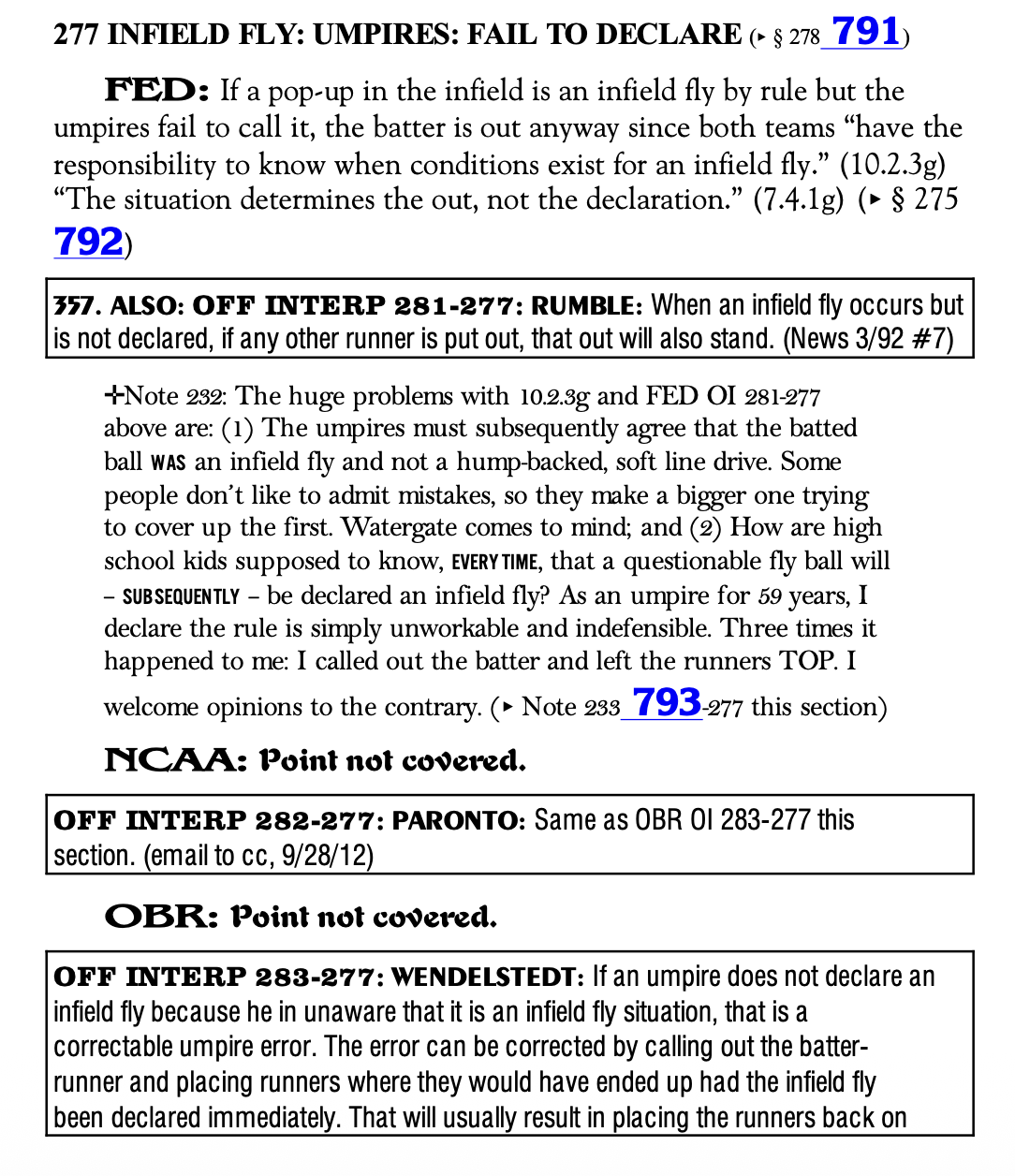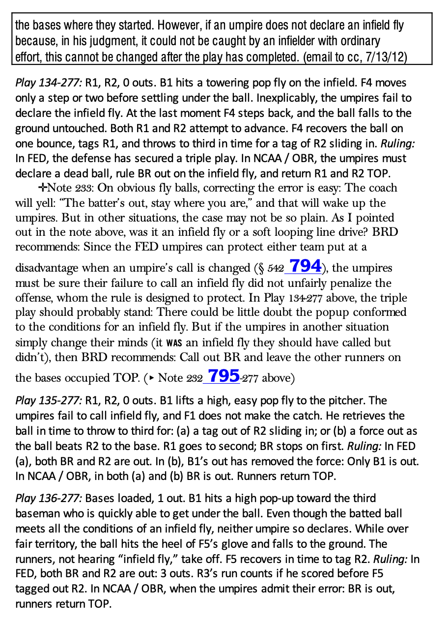 Velho Posted 10 hours ago Report Posted 10 hours ago Two discussion points this play triggers for me: 1) If IFF isn't called real time but in retrospect it should have*, how do you deal with that? @grayhawk covered that well. Batter out, runners return, move on. * I'm having problems finding cites for the generally accepted practice of calling it after the fact. I see it in J/R (page 54 16th edition/2022). Anyone have anything? 2) One of my windmills: A) Should it be called based on the location of the ball for that level? B) Should it be called based on the location of the ball for where those fielders started (if shifted for example)? c) Should it be called based on the actual actions of those exact players on that exact play (i.e. the "see the fielder camped at the apex")? In this one, imo, this one meets A and B - that ball should be caught with reasonable effort. As for C, none of the defense ever had that play managed. F5, F1, and F3 all were spectators letting F2 struggle. You can be assured the defense coach was on F5 or F1 for not calling for that ball. Quote